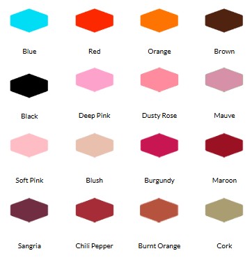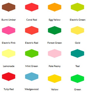 Burnt Umber, Coral Red ,Egg Yellow, Electric Green, Electric Pink, Electric Red, Forest Green, Gold, Lemonade, Mint Green, Pale Peony, Teal, Tulip Red, Wedgewood,Yellow, Green, Blue ,Red, Orange, brown, Black, Deep Pink,, Dusty Rose, Mauve, Soft Pink, Blush, Burgundy, Maroon, Sangria, Chili Pepper, Burnt Orange, Cork ,آبی |