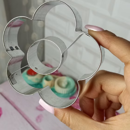 خمیر را روی سطح صاف باز کنید، کاتر را روی آن فشار دهید تا طرح دونات گلدار ایجاد شود.