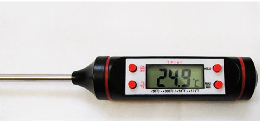 دماسنج را داخل مایع مورد نظر قرار دهید به طوریکه نوک استیل آن در مایع باشد. چند ثانیه صبر کنید تا دما ثابت شود، سپس عدد نمایش داده شده را بخوانید.