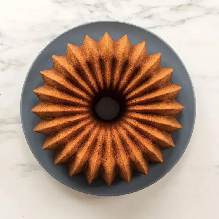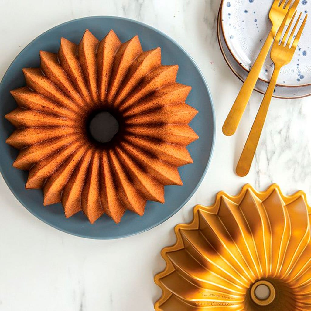 قالب Nordic Ware Brilliance Bundt Pan با طراحی ششضلعی نورانی و زوایای منشوری، تجربهای بصری منحصربهفرد از پخت کیک ارائه میدهد. این قالب دارای ظرفیت ۱۰ پیمانه است که برای کیکهای بزرگ خانگی یا مراسم مناسب است. جنس آن از آلومینیوم ریختهگری با پوشش نچسب بدون PFAS است که تا حد امکان کیک را سالم و دقیق از قالب جدا میکند. سطح داخلی رنگ مات یا طلایی چشمنواز و جلوهای لوکس دارد و درعینحال پوشش نچسب باعث شده خروج کیک صاف و آسان انجام شود. مشتریان معمولاً نگرانی دارند که جزئیات قالب در کیک بیفتد؛ اما طراحی غنی و توزیع حرارت یکنواخت باعث حفظ دقیق جزئیات منتهی به جلوهای حرفهای میشود.