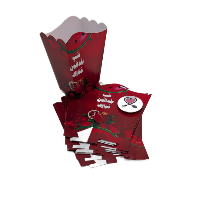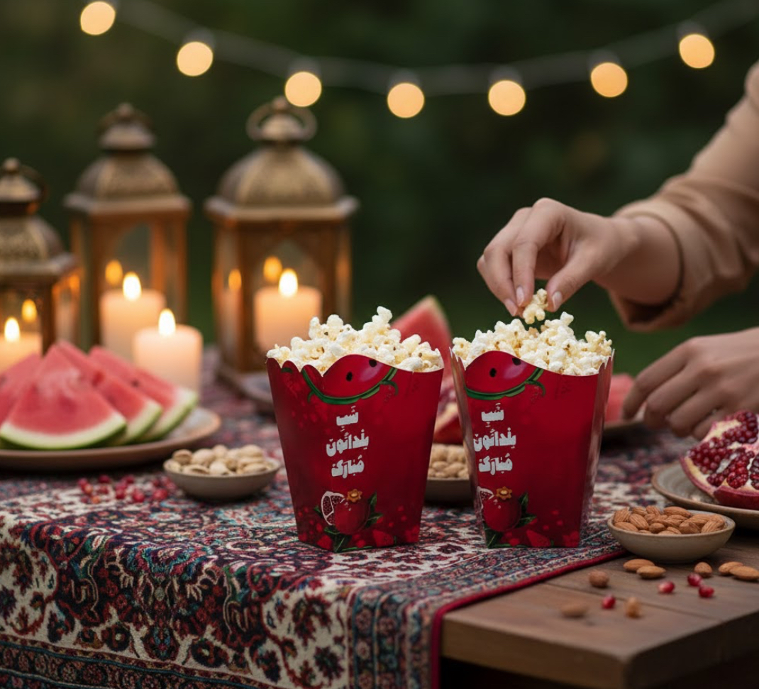 - ظرف پاپکورن کاغذی: ظرفی سبک و بهداشتی برای پاپکورن، آجیل یا تنقلات. برای خرید تکی، ظرف پاپکورن از اینجا قابل سفارش است → (لینک).