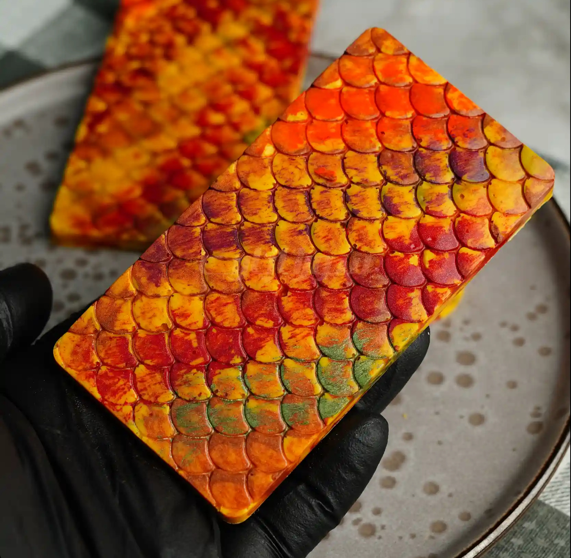 قالب کد ۵۵ قابلیت شستشو دارد و نگهداری آن آسان است، که برای استفادههای مداوم در قنادی بسیار حیاتی است. طراحی “پولکی” یا اسکِیلی (scaly) آن، باعث جلوهی بصری ویژهای در شکلاتهای تولیدی میشود؛ شکلات شما با این قالب ظاهری حرفهایتر و چشمنوازتر خواهد داشت. این قالب برای تولید انواع شکلات تبلتی، بار شکلات و ترافل استفاده میشود، و به دلیل دوام بالا، سرمایهگذاری هوشمندانهای برای قنادانی است که کیفیت و زیبایی محصول نهایی برایشان اهمیت دارد.