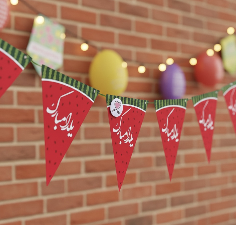 این ریسه شامل ۱۰ عدد پرچم مثلثی از جنس مقوای گلاسه مرغوب است که با یک نوار قیطانی یا روبان مقاوم به هم متصل شدهاند. وجه تمایز این محصول، کیفیت چاپ بسیار شفاف و رنگهای زندهی قرمز و سبز آن است که تحت نورپردازی محیط، کدر نشده و درخشش خود را حفظ میکنند. طرحهای گرافیکی هندوانه و انار روی هر پرچم، بهگونهای طراحی شدهاند که از فاصلهی دور نیز کاملاً قابل تشخیص باشند و “تم یلدا” را با صدای بلند فریاد بزنند.