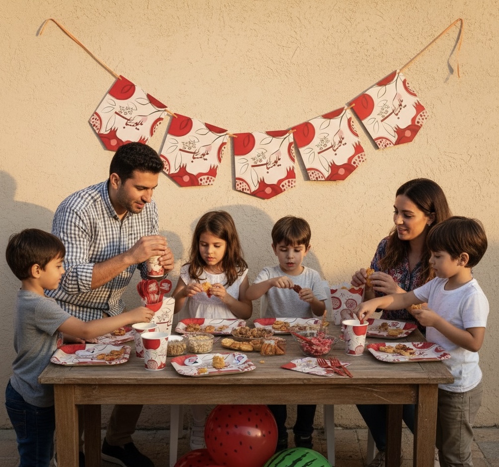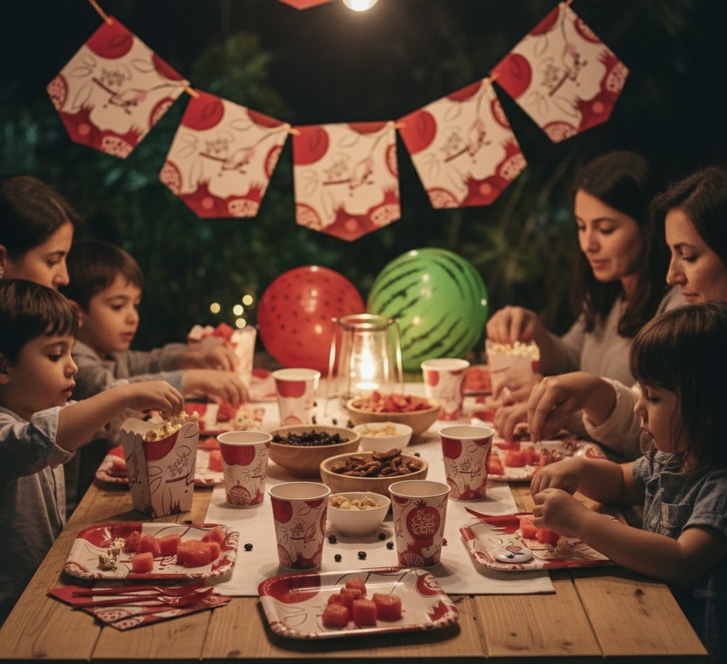 - پیشدستی و لیوان کاغذی: پیشدستی و لیوان سفید با طرح یلدایی انار، سبک و مقاوم است و سرو شیرینی، آجیل و نوشیدنی را آسان و بهداشتی میکند. ظاهر هماهنگ آن باعث میشود میز جشن شما حرفهای و منظم به نظر برسد. استفاده از این ست یکبار مصرف، جمعآوری میز را پس از جشن کاملاً بیدردسر میکند. لینک خرید تکی → (لینک)