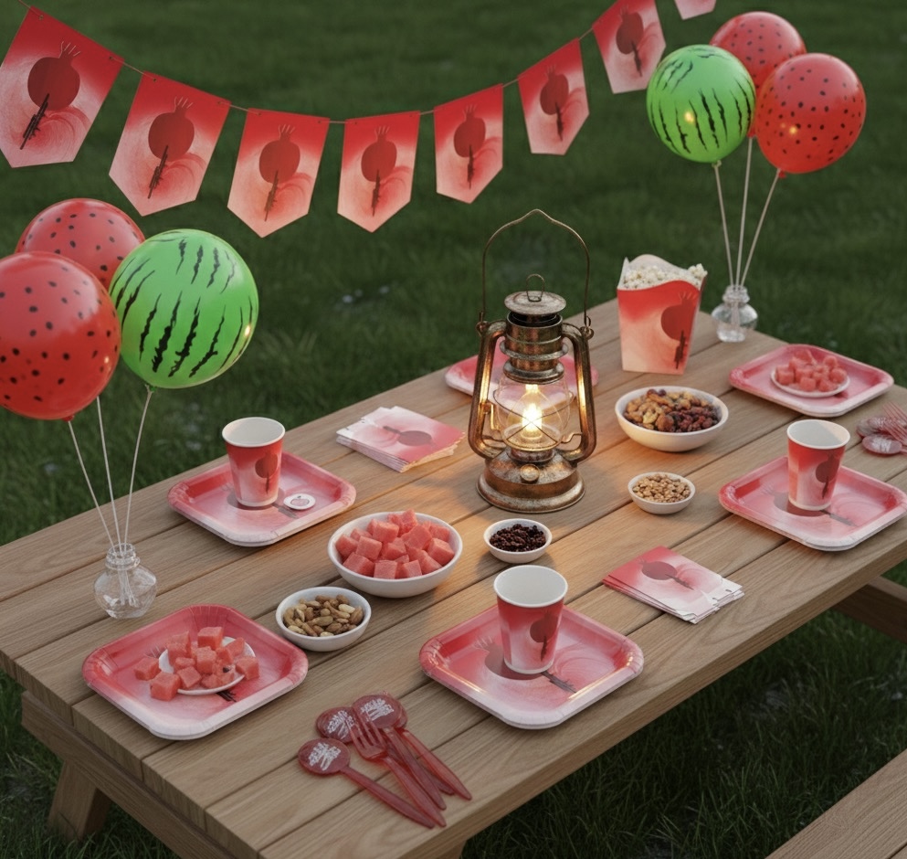 - بادکنک لاتکس هندوانه قرمز: بادکنک قرمز با طرح هندوانه، رنگ اصلی تم یلدا را کامل میکند و جلوهای شاد و پرانرژی به میز و فضای جشن میدهد. برای خرید جداگانه، میتوانید از این لینک اقدام کنید.